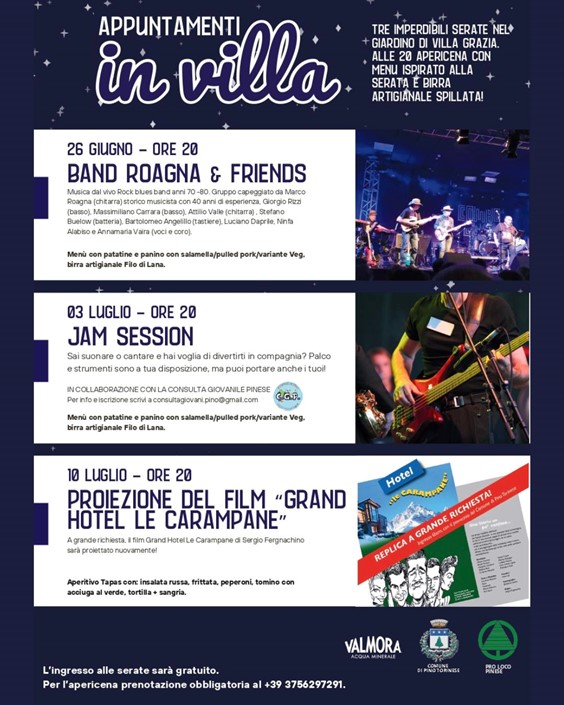 “Appuntamenti in villa”: al via mercoledì 26 giugno le serate a Villa Grazia organizzate dalla Proloco di Pino Torinese: