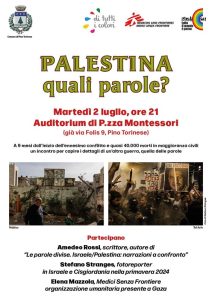 Nell’ambito del Festival Tutto il Mondo è Paese, martedì 2 luglio alle ore 21:00, presso l’Auditorium di Pino, si terrà l’iniziativa “Palestina. Quali parole?” promossa dall’Associazione Di Tutti I Colori in collaborazione con Medici Senza Frontiere.