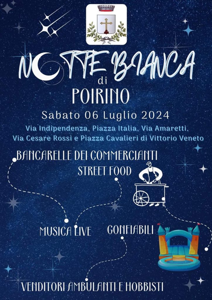 A Poirino, commercianti e attività locali protagoniste della “Notte bianca” in programma sabato 6 luglio dalle 19,30. Alcune attività poirinesi offriranno specialità culinarie che vanno dall’antipasto ai meravigliosi dessert. E non mancherà tanto altro street food per deliziare ogni palato. Previsti Intrattenimenti per Bambini: tante attività e divertimento dedicati ai più piccoli per una serata di pura magia. Special Guest: Roberto Molinaro con la sua musica straordinaria, rendendo la notte ancora più speciale.