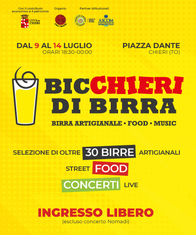 BicCHIERI di Birra ritorna a Chieri, nella sua quarta edizione, da martedì 9 a domenica 14 luglio 2024: un festival dedicato alla grande birra artigianale di qualità, con street food e musica live, organizzato dalla Pro Chieri con il sostegno del Comune di Chieri ed in collaborazione con Confcommercio Ascom Chieri.