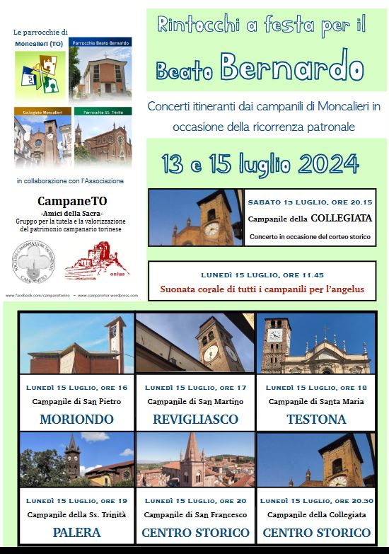 Nei giorni 13 e 15 luglio 20204 il gruppo CampaneTO dell’Associazione Amici della Sacra e le parrocchie di Santa Maria della Scala, Santissima Trinità e Beato Bernardo di Moncalieri hanno organizzato il “Rintocchi a festa per il Beato Bernardo”, la rassegna di concerti campanari proposti da alcuni campanili cittadini in occasione della patronale.