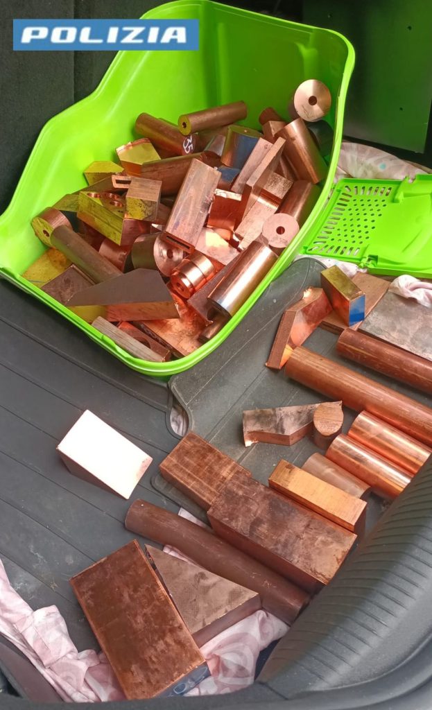 Durante le fasi del controllo, i poliziotti riscontrano che nel veicolo sono presenti due uomini e che il cofano posteriore è completamente abbassato come se all’interno ci fosse qualcosa di molto pesante. Infatti, dalla perquisizione veicolare si rinvengono circa 140 kg di rame suddivisi in 86 pezzi, diversi cacciaviti a taglio e a stella di diverse lunghezze variabili da 17 cm fino a 28 cm e un disco per smerigliatrice di 6 cm.