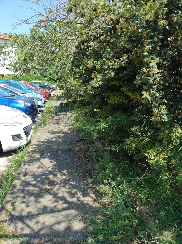 “Complici di certo gli abbondanti rovesci primaverili, quest’anno il verde in genere è letteralmente esploso. Nelle foto allegate le fronde invadono il marciapiede, lato parco, di Via Can. G.Chiadó e sovrastano totalmente i manufatti cementizi, sia sedute che schienali, fronte area di sgambamento cani della zona, rendendoli di fatto impraticabili.