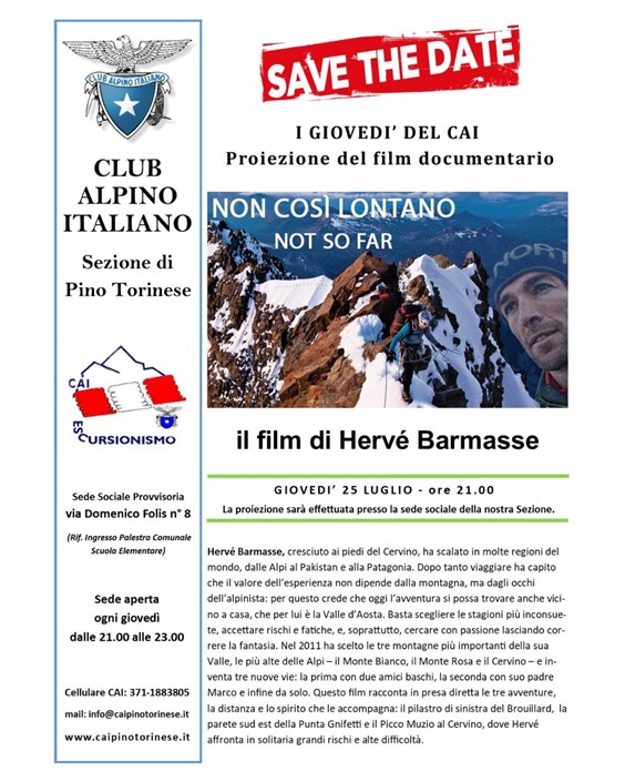Nell’ambito de “I giovedì del CAI” del CAI sezione di Pino Torinese, giovedì 25 luglio alle ore 21:00, presso la sede sociale di Via Folis 8, verrà proiettato il film documentario “Not so far – Non così lontano” di Hervé Barmasse.