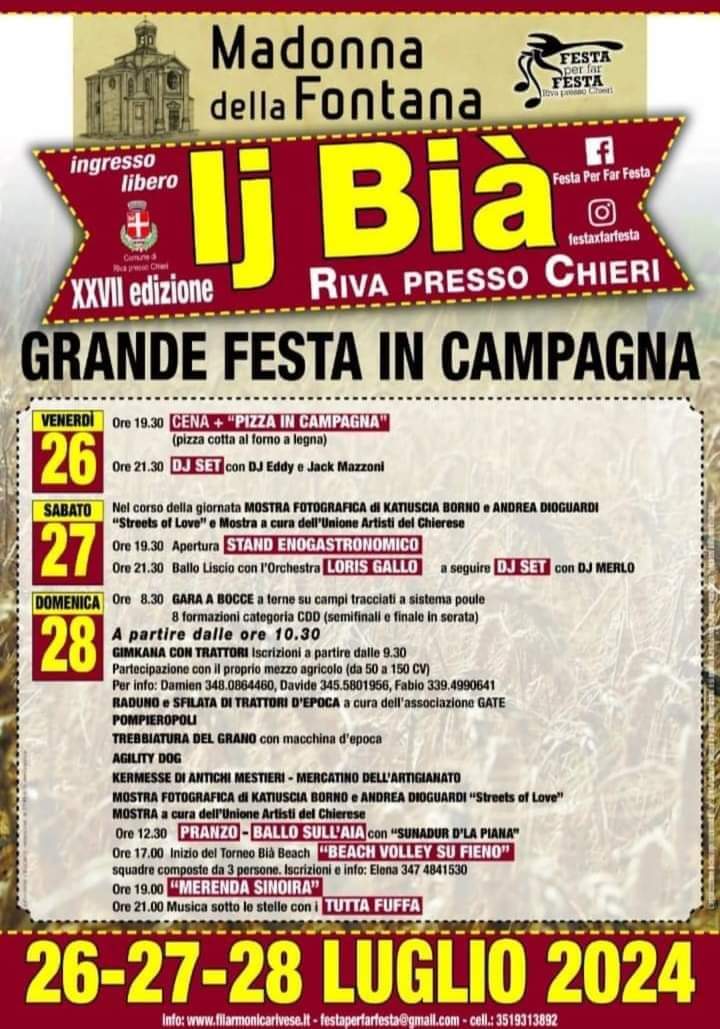 RIVA PRESSO CHIERI – Madonna della Fontana XXVII edizione de ” Ij Bià ” Grande festa della Campagna di Redazione · 26 Luglio 2024 Visto da: 1.442