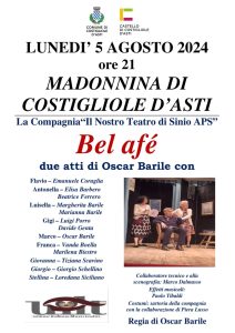 La stagione teatrale accoglie,  gli attori de “Il nostro teatro di Sinio” con lo spettacolo “Bel Afè” in scena lunedì 5 agosto alle 21. Due atti di Oscar Barile con la regia di Oscar Barile  che narra delle difficoltà delle giovani coppie di oggi, che incontra mille difficoltà Chi ancora trova il coraggio di formare una famiglia, e devono affrontare problemi e ostacoli cui una volta sopperivano le grandi famiglie. La mancanza di tempo, l’attenzione ai bambini, il dover conciliare lavori sempre più precari con orari a volte impossibili, l’assistenza a genitori che invecchiano e altri parenti con manie e bisogni particolari si scontrano con le necessità ordinarie di ogni famiglia, a cui lo Stato sembra prestare un’attenzione a volte fatta soltanto di parole vane e appare non in grado di sostenere concretamente chi rappresenta il domani di una nazione.