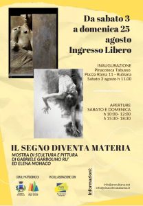 Nei rinnovati spazi espositivi della Pinacoteca Comunale Francesco Tabusso, in Piazza Roma 11 a Rubiana, dopo la rassegna personale “Emozioni torinesi” di Fernando Eandi, si può ora vedere e seguire sino al 25 agosto la doppia mostra temporanea “Il segno diventa materia”, con una pregevole selezione di lavori dello scultore Gabriele Garbolino Rù e della pittrice Elena Monaco.