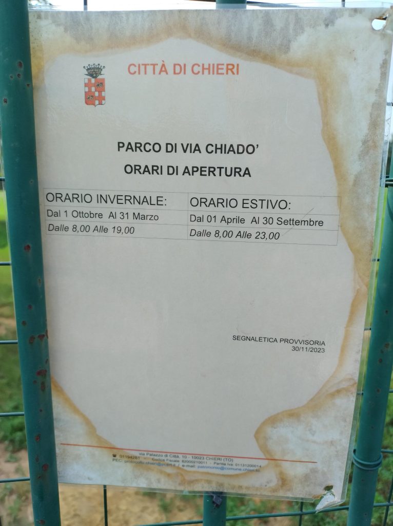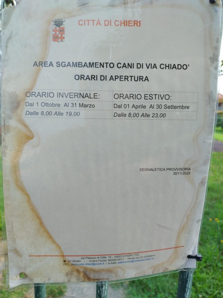 “Nonostante su entrambi i cartelli, in basso a destra, sia riportata la dicitura in oggetto, nonostante gli eventi metereologici avversi (pioggia, neve, gelo e vento) li abbiano ridotti come risulta evidente dalle immagini, dopo 9 mesi ovvero oltre un normale parto non sono ancora stati sostituiti con altri “definitivi”, da non crederci!! Oltre che ad esser stati posizionati in modo errato ovvero scambiati: quello dell’area cani sul cancello del parco giochi dei bimbi e viceversa, preciso che in almeno 3 occasioni in passato ho segnalato in comune lo stato di assoluto quanto evidente degrado, ma senza tuttavia ottenere un benché minimo riscontro od una stima di sostituzione. Che dire: in fondo son passati “soltanto”, si fa per dire, 9 mesi ma purtroppo in certi enti pubblici nulla risulta più definitivo di qualcosa nato come provvisorio. Che tristezza” Testo e foto di Roberto Biscant