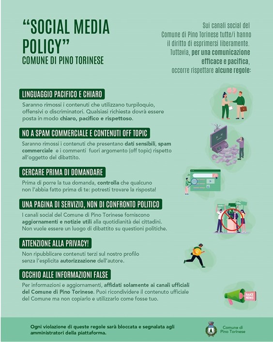 I canali social del Comune di Pino Torinese rispettano pienamente il diritto di espressione di tutti e di tutte, affinché le pagine social siano anche un luogo per confrontarsi e per esprimere le proprie esigenze e opinioni.