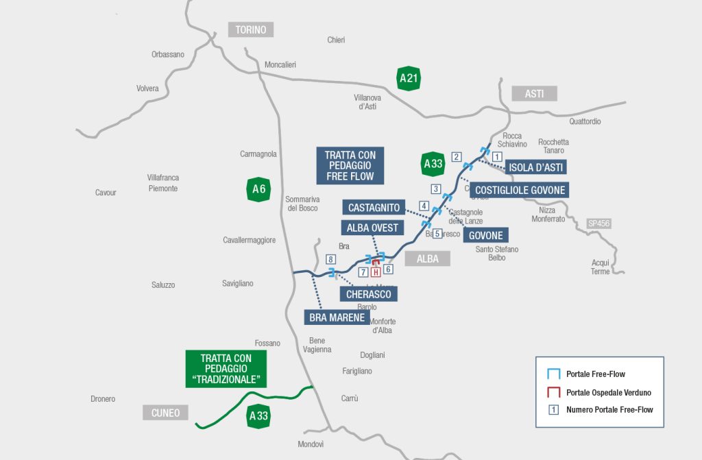 Non entrano ancora in funzione i portali 7 e 8 che saranno attivi solo dopo il completamento della tratta con eliminazione del casello di Cherasco e il portale 5 a Castagnito per cui bisognerà attendere la realizzazione della strada complanare parallela all’autostrada nei comuni di Guarene e Castagnito. Oggi percorribile solo in uscita verso Castagnito/Neive, il tratto diventerà a doppio senso di circolazione consentendo ingresso e uscita su tangenziale (presumibilmente nel 2026, con lavori di adeguamento della tangenziale completamente ultimati). Soltanto allora verrà attivato il portale 5 di Castagnito, quando la gratuità della tangenziale di Alba sarà garantita proprio dalla complanare attiva in entrambe le direzioni, sia per l’uscita che per l’ingresso in tangenziale.