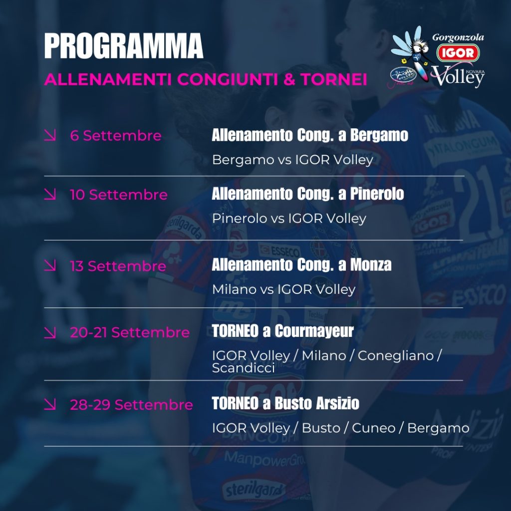 E’ ufficiale intanto il calendario degli impegni (tornei, amichevoli e allenamenti congiunti) delle azzurre per il mese di settembre: il 6 a Bergamo la prima uscita, poi ancora il 10 a Pinerolo e il 13 a Monza con il Vero Volley. A Courmayeur andrà in scena il primo grande evento, il 20 e 21 settembre, con il quadrangolare che vedrà le azzurre sfidare Milano, Conegliano e Scandicci con semifinali in programma il giorno 20 (abbinamenti da definire) e finali il 21. Una settimana più tardi, il 28 e 29, torneo a Busto Arsizio: anche in questo caso rimane da definire il programma, mentre avversarie delle azzurre saranno le padrone di casa di Busto Arsizio, Cuneo e Bergamo.