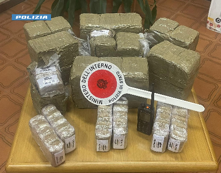 Il personale di polizia raggiunge il cittadino marocchino prima che possa allontanarsi, e controlla il bagagliaio della vettura, rinvenendo i due borsoni poc’anzi notati: al loro interno 200 panetti di hashish, per un peso di quasi 20 kg.