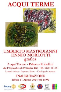 Quest’anno la Mostra ideata dai due curatori, dal titolo “Umberto Mastroianni – Ennio Morlotti – grafica”, intende rendere omaggio a Umberto Mastroianni ed Ennio Morlotti, massimi artisti del ventesimo secolo, che saranno i protagonisti di una mostra che raccoglie circa 70 opere (calcografie-acqueforti, litografie, serigrafie, tecniche miste), appartenenti alla collezione di Adriano e Rosalba Benzi. La Mostra si terrà presso i locali di Palazzo Robellini di Acqui Terme (Piazza Abramo Levi, 7) dal 1° settembre al 27 ottobre 2024. Una rassegna che consente di ripercorrere le tappe fondamentali del loro lavoro nel campo della grafica. La Mostra sarà inaugurata sabato 31 agosto alle ore 18,30 e rispetterà il seguente orario di apertura: dal 1° settembre al 27 ottobre 2024, da martedì a domenica 10 – 12,30 e 16 – 19. Lunedì chiuso. Ingresso gratuito.