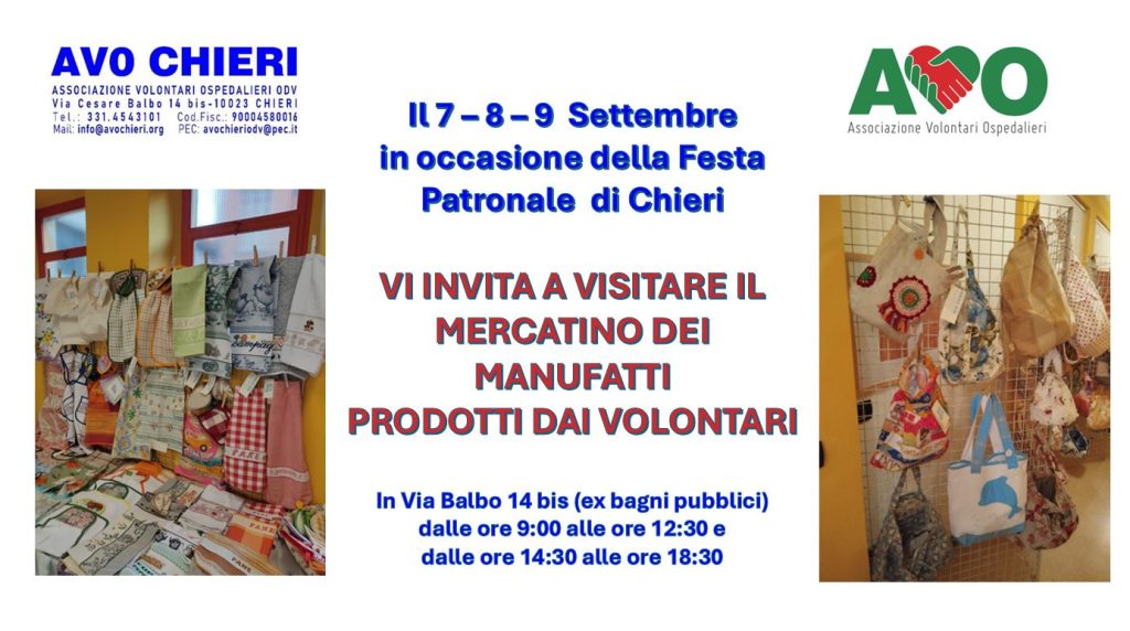 “In veste di Presidente dell’ASSOCIAZIONE VOLONTARI OSPEDALIERI (AVO CHIERI ODV), in occasione della Festa Patronale, avremmo il piacere di comunicare alla cittadinanza che sarà allestito, presso la sede di Via Balbo 14 bis, il consueto mercatino dei manufatti prodotti dai Volontari il cui ricavato sarà utilizzato per le finalità associative”. Lo scrive in una nota Mario Antinori, presidente di AVO Chieri.