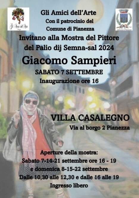 L’artista Giacomo Sampieri è stato selezionato dall’associazione degli Amici dell’Arte di Pianezza per dipingere il drappo che andrà come Palio al vincitore della corsa dij Semna-sal, che si svolge a Pianezza nella 3a domenica di settembre.