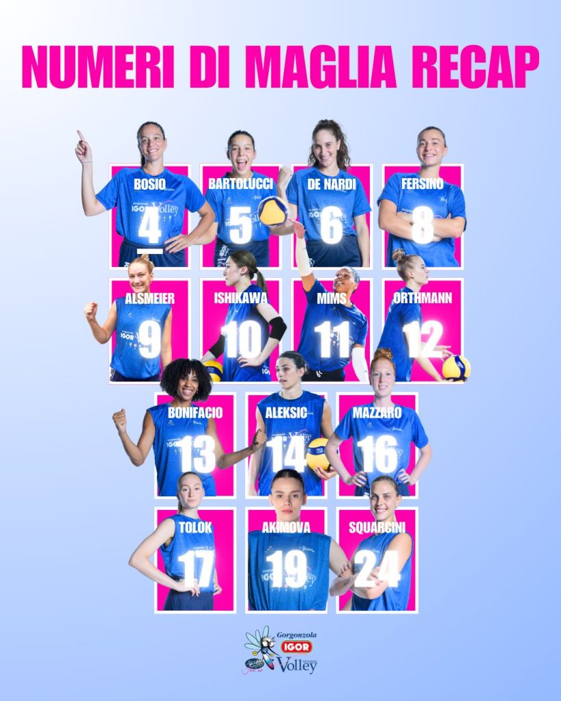 Alla vigilia del primo impegno di precampionato (domani alle 16.30 l’allenamento congiunto con Bergamo a Treviglio), è ufficiale la numerazione che accompagnerà le azzurre nel corso della nuova stagione. Tante le novità, anche tra le confermate, con alcune “prime assolute” per più di una Igorina.