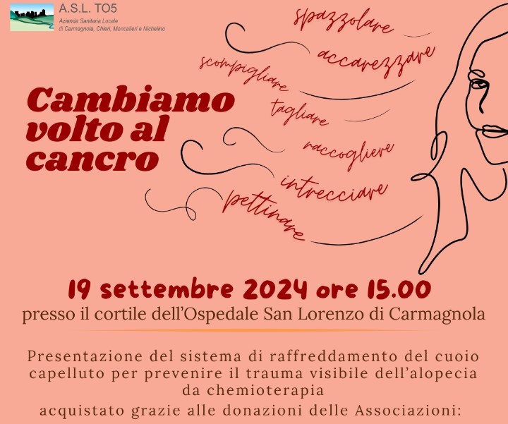 La presentazione ufficiale, che ha come titolo “Cambiamo volto al cancro”, avverrà presso il cortile dell’Ospedale San Lorenzo di Carmagnola giovedì 19 settembre alle ore 15.
