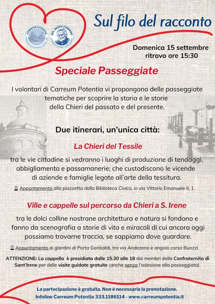 Chieri. Passeggiate “Sul filo del racconto” con Carreum domenica 15 alle 15,30 di Redazione · 14 Settembre 2024 Visto da: 192