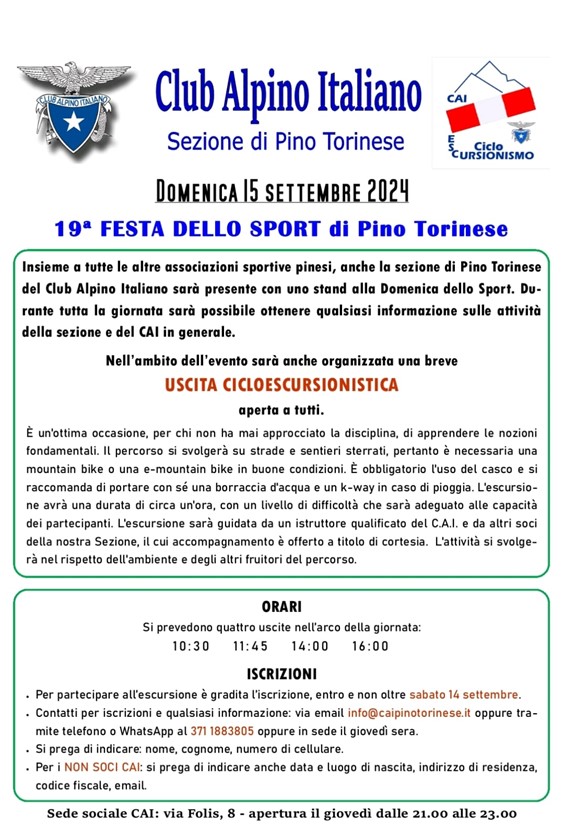 Domenica 15 settembre il CAI di Pino alla “Festa dello Sport”