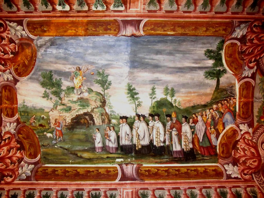 A sinistra vi è rappresentato un monte, con alla base una grande grotta e in essa un toro; davanti all’ingresso della grotta un personaggio che maneggia un arco con frecce; sopra l’ingresso San Michele Arcangelo con la bilancia in mano; nella parte destra del dipinto un Vescovo e vari prelati che guidano una processione davanti alla grotta.