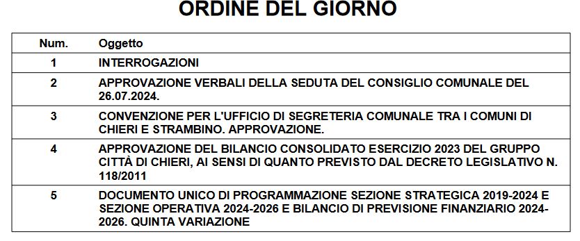 Chieri. Consiglio Comunale convocato per venerdì 27 settembre