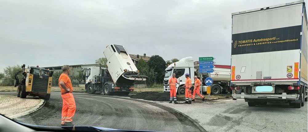 Mattinata di passione per chi percorre la ex statale 10 tra Chieri e Riva presso Chieri. In corso, all’altezza della rotonda BigMat, lavori di asfaltatura. Inevitabili lunghe code (Foto di Pierangelo Cauda)