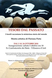 L’Ex Confraternita dei Batù di Villanova d’Asti ospiterà, dal 4 al 24 ottobre 2024, la mostra dell’artista Floriana Porta intitolata “Tesori dal passato”: un’interessante fusione tra l’esperienza pittorica e il contesto paleontologico-naturalistico astigiano. Questo incontro di mondi apparentemente distanti creerà un dialogo affascinante e stimolante per i visitatori.