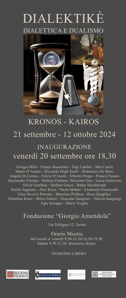 Accompagnata da un pregevole catalogo è aperta sino 12 ottobre la mostra collettiva “DIALEKTIKE’. KRONOS-KAIROS”, ospitata nelle sale della Fondazione Giorgio Amendola/Associazione Lucana Carlo Levi, in via Tollegno 52 a Torino.