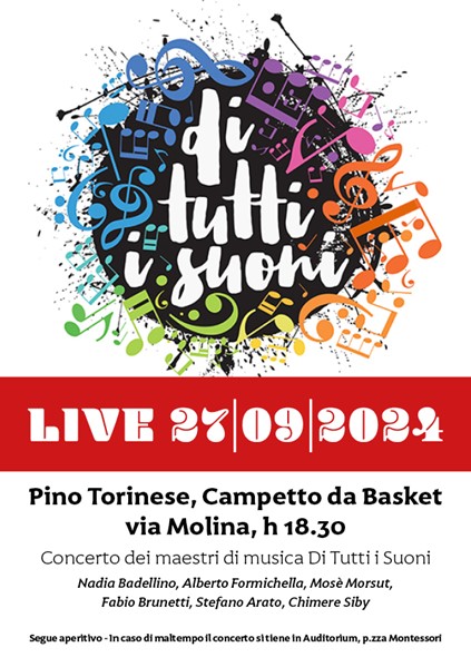 Sul Campetto da basket di Pino Torinese ci sarà una bella festa ricca di energia: un’occasione per sentire i maestri di musica “Di Tutti i Suoni” all’opera e per avere informazioni sui corsi, direttamente da loro.