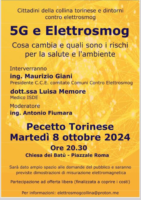 Pecetto. “5G e Elettrosmog. Cosa cambia e quali sono i rischi per la salute e l’ambiente”. Se ne parla l’8 ottobre nella chiesa dei Batù. di Redazione · 30 Settembre 2024 Visto da: 238
