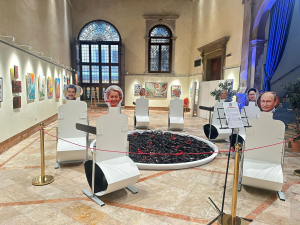 Un’opera di Silvano Mercuri, torinese, socio della Promotrice delle Belle Arti al Valentino,  è stata installata a Venezia. Si  intitola “Luci ed ombre”. due sagome accoppiate, una bianca e una nera, rappresentano la dualità del potere e dei sentimenti nascosti. Le sagome bianche, rivolte in avanti, simboleggiano la luce e l’onestà apparente, una maschera di buoni propositi e compiacenza. Tuttavia, dietro di loro, le sagome nere, rivolte all’indietro, incarnano l’ombra e la vera natura di chi cerca benefici economici e di potere. Un grande piatto sistemato al centro è colmo di cibo, dove si nutrono i personaggi di potere. Questa rappresentazione evidenzia come i potenti della terra spesso nascondano le loro vere intenzioni dietro una facciata di integrità, mentre nella società comune, l’interesse personale prevale. Mercuri ci invita a riflettere su quest’opera, mostrando come l’apparenza possa ingannare e come il vero potere risieda nell’ombra. L’artista Silvano Mercuri invita lo spettatore a interagire con l’opera, scoprendo i volti delle sagome e scrivendo sulle lavagne il proprio pensiero