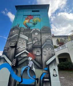 Il murale, realizzato dallo street artist  Mr Fijodor – in collaborazione con Luca Mostaccioli e con l’apporto dei pazienti di Fermata d’autobus Onlus – rappresenta alcune fra le principali peculiarità di Rivarolo Canavese: il gallo simbolo della Città, il Castello di Malgrà, le chiese barocche, il torrente Orco, un simpatico riferimento ai “Biautagambe” (che in dialetto significa ciondola gambe, derivato dalla tradizione secondo la quale era abituale passatempo dei Rivarolesi sedersi sul Ponte della Botteria, sopra la roggia comunale).