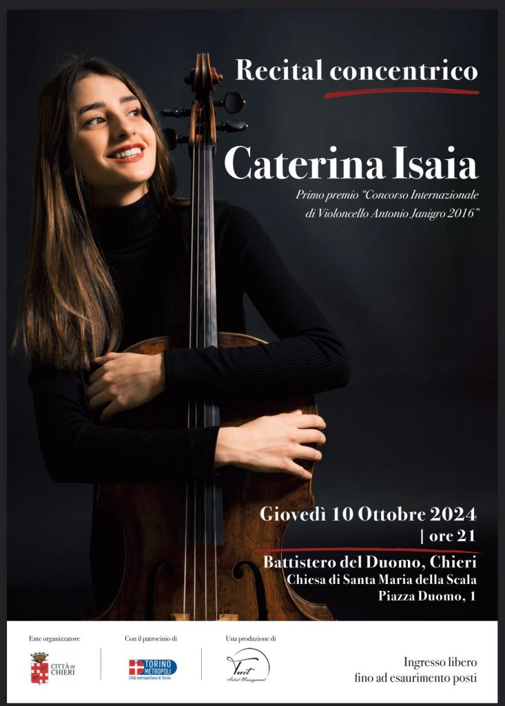 Recital concentrico della giovane violoncellista Caterina Isaia, giovedì 10 ottobre alle 21, nel battistero del Duomo di Chieri. Uno scrigno di tesori d’arte (dal ciclo pittorico quattrocentesco di Guglielmento Fantini alla Pala Tana) per un concerto di una artista di livello internazionale. Ingresso gratuto fino ad esaurimento dei (pochi, purtroppo) posti disponibili.