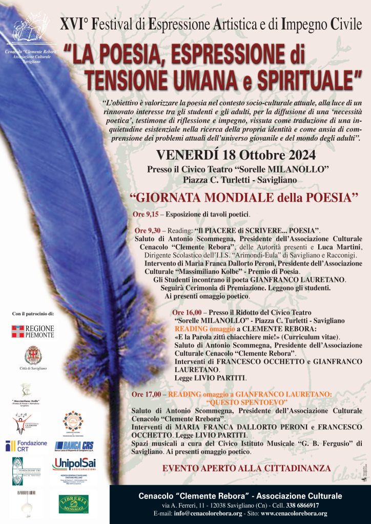 Nella mattinata di venerdì 18 ottobre alle ore 9,00 presso il Civico Teatro “Sorelle Milanollo” di Savigliano, con il Patrocinio dalla Regione Piemonte e dalla Città di Savigliano si celebrerà la “ GIORNATA MONDIALE della POESIA ” nell’ambito del XVI° “Festival di Espressione Artistica e di Impegno Civile – LA POESIA, ESPRESSIONE di TENSIONE UMANA e SPIRITUALE”.