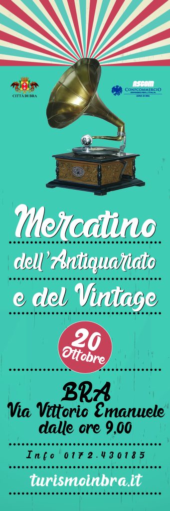 Torna a Bra il Mercatino dell’Antiquariato e del Vintage. L’evento si svolgerà domenica 20 ottobre in via Vittorio Emanuele II, lungo tutta la lunghezza della via, dall’imbocco di via Cuneo e fino alla chiesa di Santa Croce. Sarà possibile curiosare tra le tante bancarelle con complementi d’arredo, suppellettili, pezzi d’antiquariato e di modernariato, libri, dischi, monete, cartoline e tanto altro dalle 9 fino alle 19.