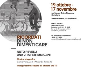 Attingendo al fondo fotografico dell’Archivio Nuto Revelli, la mostra Ricordati di non dimenticare. Nuto Revelli, una vita per immagini a cura di Paola Agosti e Alessandra Demichelis ripercorre la vita di Nuto Revelli: il giovane ufficiale in divisa, il partigiano a Paraloup ed in Francia, lo scrittore con i suoi testimoni, il marito a fianco della donna che ama, l’amico con cui condividere impegno e convivio. La mostra oltrepassa la vicenda individuale e trasporta chi osserva in un passato condiviso: nelle fotografie scorre quasi un secolo, la storia del Novecento tra dittature, guerre e rinascita e affiora il dettaglio di chi ne ha percorso ogni tappa con il piglio del testimone, in un cammino di consapevolezza umana e civile, tra impegno e vita privata.
