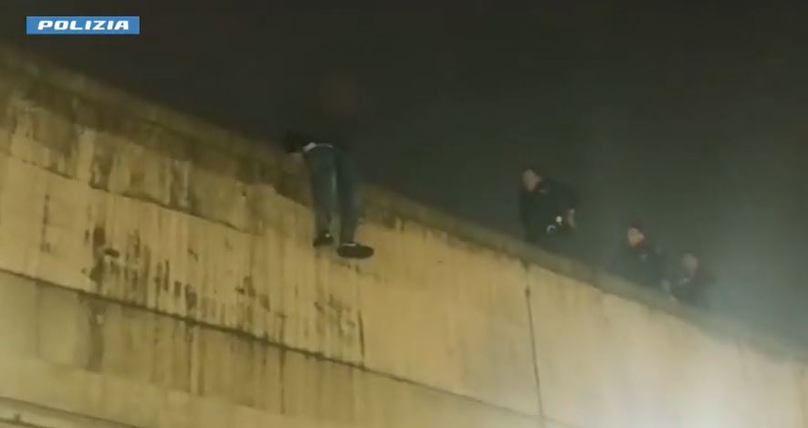 Gli agenti avanzano a piccoli passi verso il giovane, instaurando un dialogo con lui che si protrae diversi minuti, durante i quali altri operatori adibiti al soccorso posizionano un cuscino gonfiabile di sicurezza sotto il cavalcavia, qualora il ragazzo si lasci cadere.