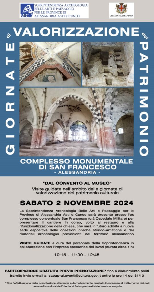 Infatti, in occasione della giornata di valorizzazione del patrimonio culturale, la Soprintendenza Archeologia Belle Arti e Paesaggio per le Province di Alessandria Asti e Cuneo sarà presente per presentare il cantiere in corso volto al restauro e alla rifunzionalizzazione della chiesa, che sarà in futuro adibita a nuova sede espositiva delle collezioni civiche storico-artistiche e dei materiali archeologici provenienti dal territorio alessandrino, nell’ambito dei lavori finanziati dalla Città di Alessandria e in parte dal Ministero della Cultura.