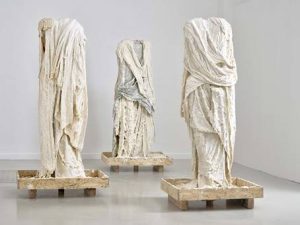 Scultrice francese, Nalbandian presenta a Torino tre monumentali figure stanti di evidente rimando all’antico. L’idea di reperto appartiene da sempre alla sua pratica artistica reinterpretato però secondo un impiego inatteso dei materiali, come accade a Torino con Panacée, tre opere che se di prim’acchito paiono figure in marmo, a uno sguardo ravvicinato rivelano la loro consistenza di stoffa e sapone, quest’ultimo proveniente dal saponificio Fer à Cheval di Marsiglia, fabbrica d’antica tradizione con cui l’artista collabora da anni. È proprio nel gioco dell’illusione, nell’inversione tra percezione e realtà, che l’opera di Nalbaldian balza nel contemporaneo tracciando sia un dialogo tra forme che appartengono alla scultura antica sia omaggiando l’eredità dell’Arte Povera che proprio a Torino ha avuto uno dei suoi luoghi nevralgici.