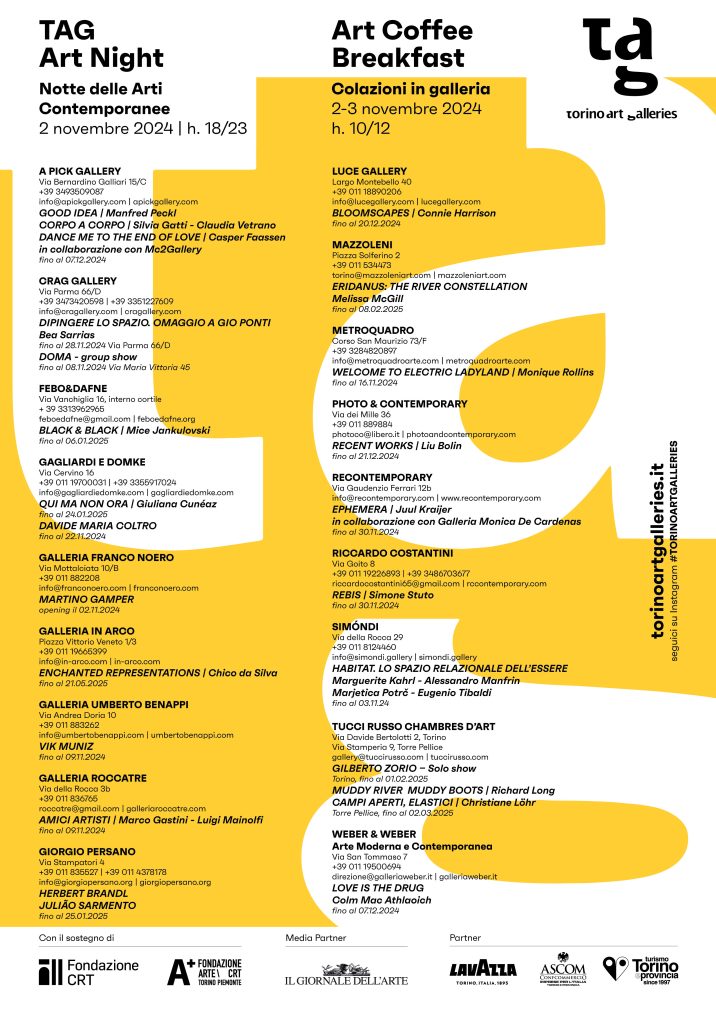 L’Associazione TAG – Torino Art Galleries in concomitanza della settimana dell’arte torinese e in concomitanza di Artissima, è lieta di annunciare la 28esima edizione della “TAG – TORINO ART NIGHT”, durante la Notte delle Arti Contemporanee, che si terrà sabato 2 novembre 2024 dalle ore 18 alle 23, un percorso delle mostre proposte dalle gallerie torinesi associate a TAG, realizzato grazie al sostegno della Fondazione per l’Arte Moderna e Contemporanea CRT, unico ente sostenitore sin dalla prima edizione. Fondata nel 2000, l’Associazione TAG – Torino Art Galleries – riunisce attualmente 18 gallerie d’arte torinesi.