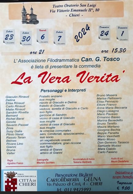 L’associazione filodrammatica “Canonico Tosco” torna sul palcoscenico del  Teatro San Luigi di Chieri con una commedia brillante “La vera verità”.