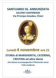 “Storie di Margherita, Caterina, Cristina e altre dame, duchesse di casa Savoia” per il ciclo Storie Straordinarie di Donne Straordinarie, che vuole individuare e narrare personaggi femminili, talvolta poco noti, che hanno avuto un’impronta significativa nella nostra storia.