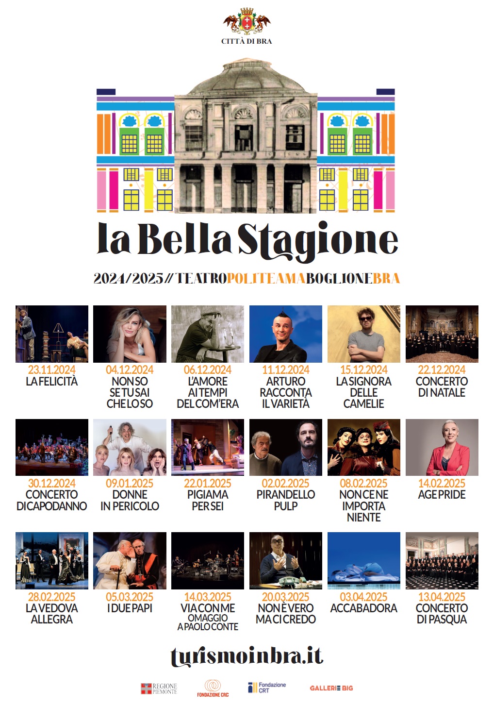 Dopo il tutto esaurito registrato dagli abbonamenti all’intera stagione teatrale, da lunedì 11novembre 2024 parte la vendita dei biglietti singoli per gli spettacoli in cartellone da novembre ad aprile 2025 al Teatro Politeama Boglione di Bra.I biglietti sono acquistabili tutti i lunedì pomeriggio dalle 16 alle 19 al botteghino del Teatro, in piazza Carlo Alberto e, a partire dal 18 novembre, anche on line sul circuito www.ticket.it. Il costo è di 23 euro, ridotto a 20 per gli over 65 e gli under 26, per gli spettacoli in abbonamento, mentre gli appuntamenti fuori abbonamento costano 15 euro; il concerto di Natale e quello di Pasqua sono invece ad ingresso gratuito. La nuova stagione del Politeama Boglione, che quest’anno festeggia il ventennale della sua riapertura, prende il via sabato 23 novembre con “La Felicità” di Eric Assous, diretto e interpretato da Gianfelice Imparato, pièce estremamente divertente che riesce a descrivere perfettamente l’amore non convenzionale. Tutti i titoli in programma si trovano sul sito www.turismoinbra.it.Maggiori informazioni all’Ufficio Cultura del Comune di Bra, in piazza Caduti per la Libertà 20,chiamando il numero 0172.430185 o scrivendo a turismo@comune.bra.cn.it.