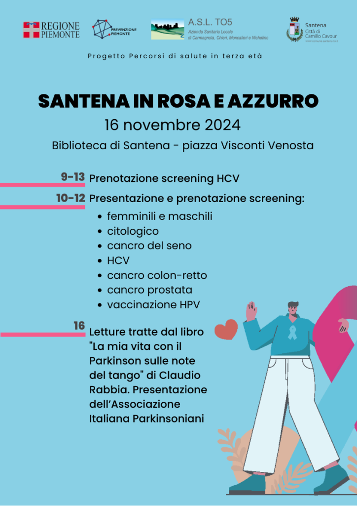 Proseguono a Santena gli appuntamenti dedicati alla prevenzione della salute e della prevenzione, organizzati in occasione del Mese Rosa e Azzurro. Sabato 16 novembre, la Biblioteca Civica, in piazza Visconti Venosta, ospiterà alcune iniziative rivolte principalmente alla popolazione adulta e alla terza età.