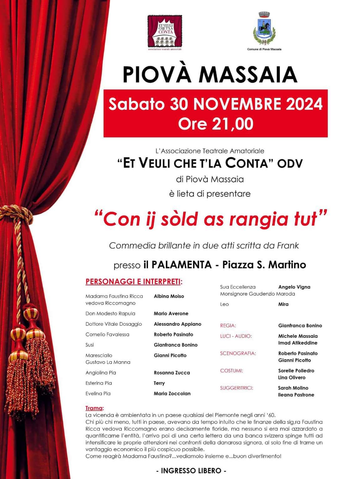 PIOVA’ MASSAIA. Sabato 30 novembre “Con ij sòld as rangia tut” al Palamenta.