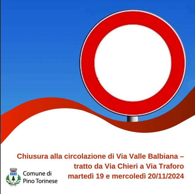Si comunica che per la riparazione del canale di raccolta delle acque meteoriche in prossimità dell’impianto semaforico di Via Traforo, Via Valle Balbiana, nel tratto da Via Chieri a Via Traforo, sarà chiusa alla circolazione veicolare martedì 19 novembre 2024, dalle ore 9:00 alle ore 24;00, e mercoledì 20/11/2024, dalle ore 0:00 fino alla ore 18:00 circa.