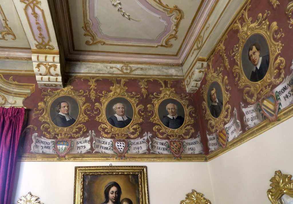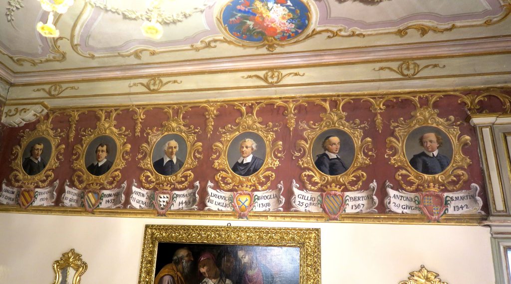 È del tutto inaspettato, per chi entra in quella sala, trovarsi in un ambiente che riecheggia l’atmosfera di tante sale di residenze reali con le teorie di Re o Imperatori, o di castelli con i ritratti dei nobili che li hanno posseduti e abitati, o di vescovadi, con le teorie di Vescovi o Arcivescovi che hanno governato la Diocesi. Con in più il particolare non secondario che questi ritratti sono in buonissimo stato. Dipinti a guazzo (cioè ad un tipo di tempera particolarmente carico ed opaco), i loro colori sono vivi e integri: merito del restauro voluto dal curato don Andrea Oddenino ed eseguito da Gabriele Ferrero alla fine dell’Ottocento, nel periodo in cui il pittore era a Chieri impegnato nel restauro del Duomo.