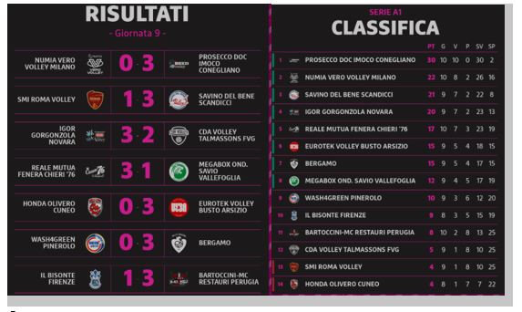 La nona giornata di regular season ha visto disputarsi, in quel di Milano, la partita clou il classico tra Milano e Conegliano che ha visto prevalere nettamente la squadra veneta rispetto alla compagine milanese. In sostanza una partita a senso unico che ha visto soccombere le lombarde nonostante gli altisonanti proclami., apparsi su alcune testate nazionali, a favore delle milanesi. Per Lavarini & company ci saranno altre occasioni ma il livello tecnico messo in campo da Conegliano è stato impressionante e se il buongiorno si vede dal mattino in questo momento non vedo formazioni, nemmeno a livello internazionali, capaci di scalfire la corazzata veneta. Ma veniamo alle compagini Piemontesi incominciando da Novara che ha disputato un match poco convincente che ha collezionando una vittoria ottenuta con molta fatica, da notare la palleggiatrice fruiluana Eze che, nonostante sia alla sua prima stagione in A1, mi ha impressionato per il suo ordine di gioco in futuro sentiremo parlare di lei. Per quanto riguarda Chieri le collinari si sono imposte su Vallefoglia, mentre le altre due formazioni, Cuneo e Pinerolo hanno subito due sconfitte casalinghe una nota merita la formazione pinerolese che quest’anno non riesce ad avere la stessa continuità dello scorso campionato molto probabilmente, come accade per Milano, si stanno facendo sentire gli effetti di un’estate olimpica che ha visto protagonista la palleggiatrice Carlotta Cambi.