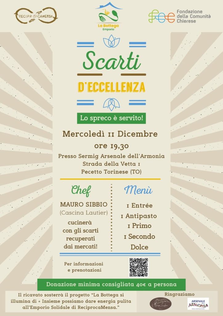 Scarti d’eccellenza è un progetto di Reciprocamensa, che ha avuto inizio il 6 dicembre del 2016 e ha visto la realizzazione di sette serate, l’ultima il 21 gennaio del 2020. Si tratta di cene realizzate da giovani Chef piemontesi, alcuni di loro oggi stellati, con i prodotti recuperati dai mercati cittadini e da altre donazioni.