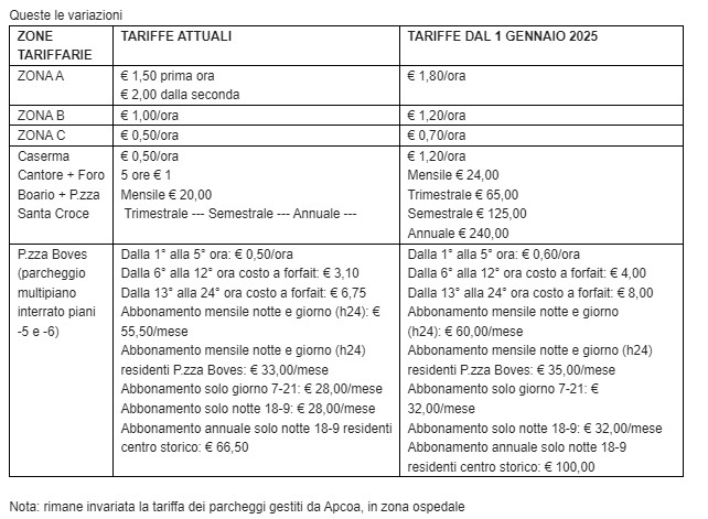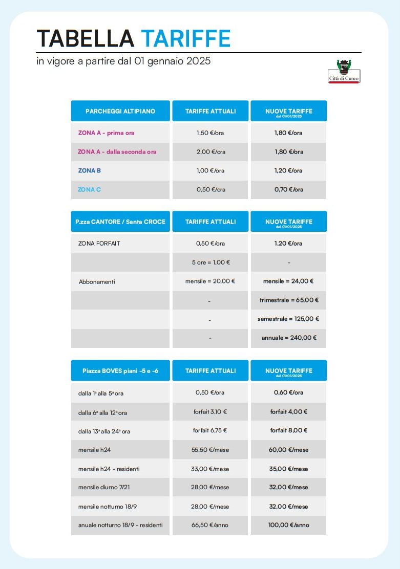 A partire dal 1 gennaio 2025 entreranno in vigore nuove tariffe per i parcheggi blu e sarà aumentato il numero di stalli a pagamento sull’altipiano. La decisione della Giunta comunale di Cuneo nasce da una valutazione complessiva delle politiche cittadine di mobilità e dei costi dei servizi e degli incentivi per la mobilità sostenibile. Infatti, i proventi derivanti dai parcheggi contribuiscono a coprire le spese delle agevolazioni per il trasporto pubblico locale, spese che negli ultimi tre anni hanno subito un notevole incremento.